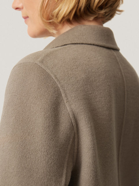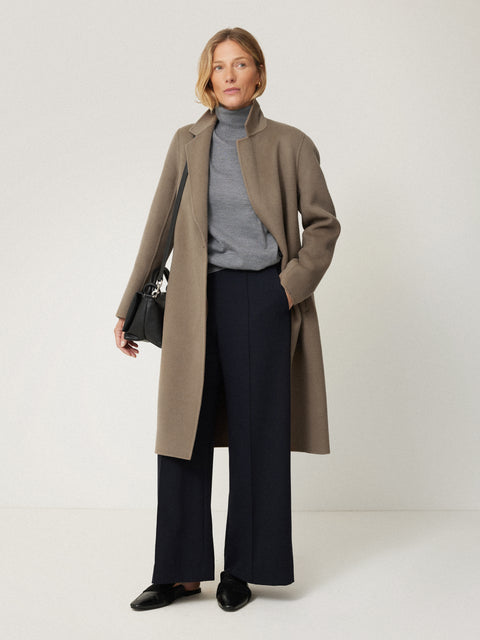 When it comes to our double faced designs, our in-house atelier team use secret stitching to bond both pieces of wool together for the highest quality and longevity in every piece. This double faced coat is a lightweight solution for keeping warm in the spring and autumn in a relaxed, single breasted shape which falls below the knee.