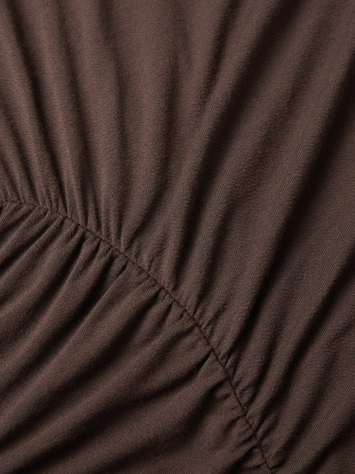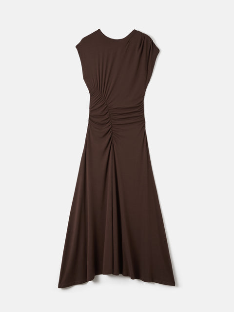 Cut from sustainably-certified Ecovero viscose, this slim-fitting dress is lightweight and drapes beautifully. The asymmetrical shoulder pleat detail and diagonal ruching across the waist creates an animated silhouette. Minimalistic yet modern, style under a classic trench now and with chunky sandals later. Fit and Features