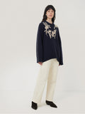 This season, we've added more feminine elements to our knitwear, drawing inspiration from this season's prints. This navy jumper has been crafted from soft wool and showcases bold, hand-embroidered floral motifs to stand out against the ink blue backdrop, while contrasting chunky embroidery stitch lines add extra texture and a deconstructed, raw-edge feel. Its slouchy, longer-line silhouette enhances the sense of ease and comfort, making it a perfect blend of relaxed style and detailed craftsmanship.