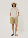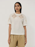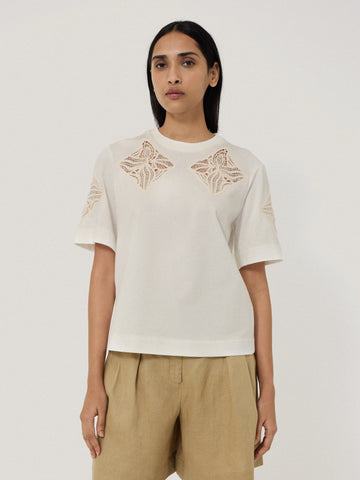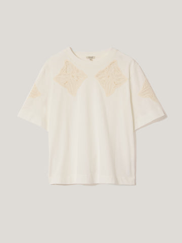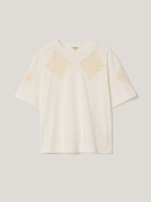 The classic tee is given a summer-ready spin with this design. This mid-weight cotton jersey style is adorned with cream crochet knit patches and running stitch detail around the neckline, lending artisanal and handcrafted elements to the everyday wardrobe basic.