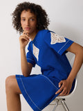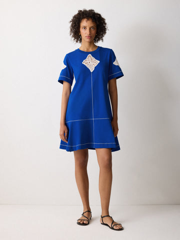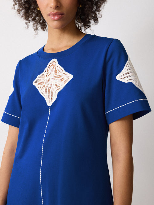 The T-shirt dress is given a summer-ready spin with this design, detailed with cream crochet knit patches and running stitch panels lend an artisanal twist.