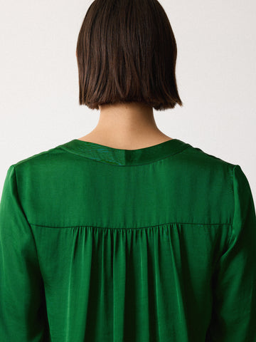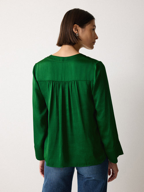 Sustainable in a luxe recycled satin, this blouse is framed with gentle gathering at the shoulders and long flowing sleeves. Open cuffs add a contemporary tailored twist to this top, perfect for both day and night wear.