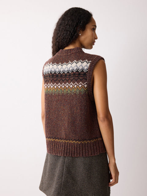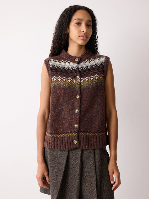 Our Fairisle Knit Waistcoat is a versatile piece for a wardrobe, perfect for layering or by itself it features a textured knit with a Fairisle design, button front and ribbed hem. Kenlly is 5'9.5 and wears a size 8