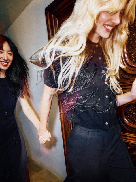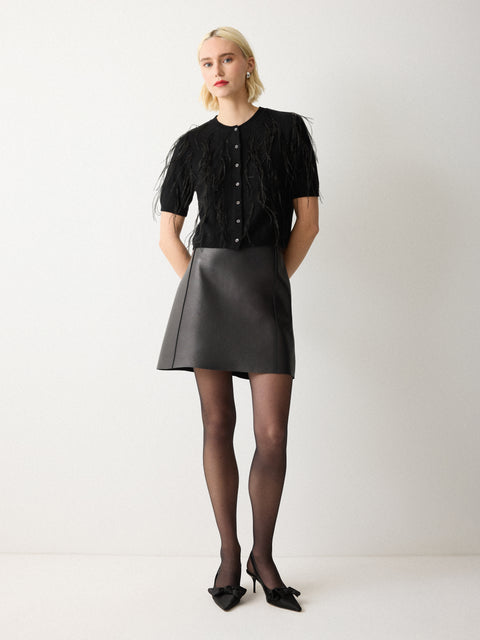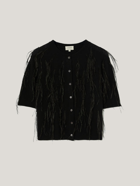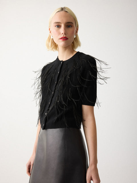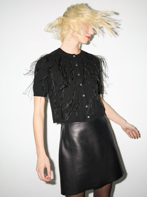 Sumptuous and cosy in a blend of wool and cashmere, this cardigan is embellished with responsibly sourced feathers for a showstopping finish. The boxy silhouette is designed for a contemporary look and allows for versatile styling options. Team this cardigan with a pair of leather trousers or bring romance to your ensemble with a midi skirt on a fluid bias cut.