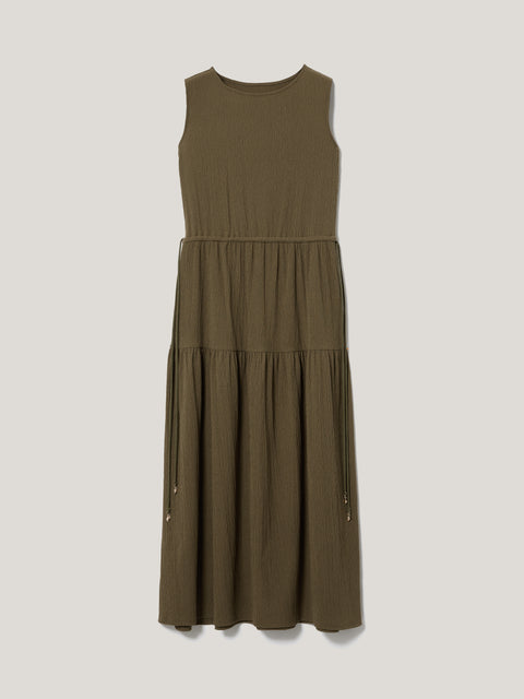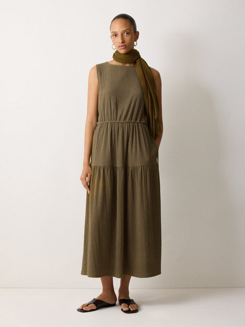 A summer throw-on is one of those pieces you will reach for again and again on warmer days. This sleeveless maxi will give back in the wardrobe in a fine crinkle jersey with a relaxed fit, an elasticated waist for comfort and a tiered skirt. Add interest with one of our pashmina scarves and gold jewellery.