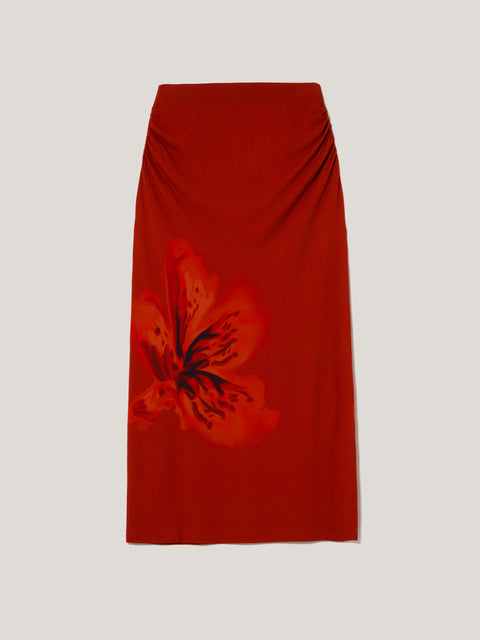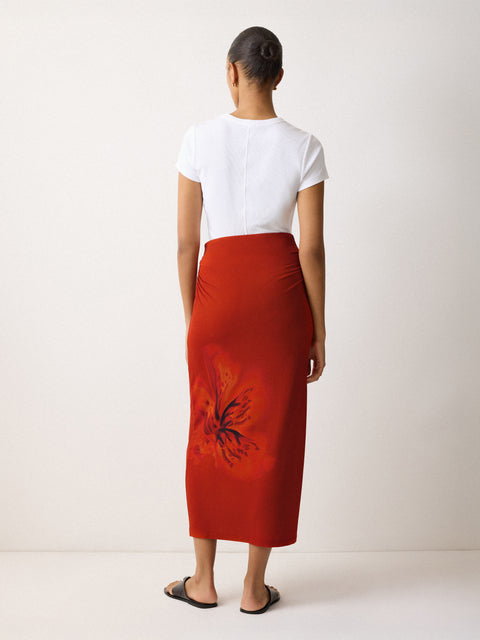 Inspired by the vibrancy of the Fire lily, this jersey skirt depicts the flower in a graphic red jersey co-ord to turn up the heat throughout the summer. Gold jewellery pieces will add a luxe finish for evening.