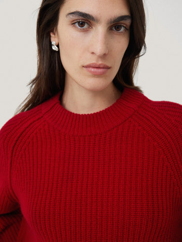 A crew neck take on our signature Fisherman's jumper, this forever knit is woven from responsibly sourced merino wool. The rib, sometimes called half cardigan stitch, was traditionally used on men's fishing jumpers which we have reworked for a modern twist using external seams on the raglan armholes and collar. This comes in our bespoke colour of the season, a deep Cinema Red.