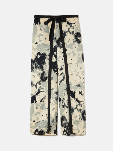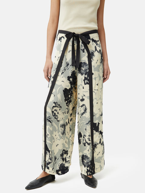 The wrapped look without the faff. This relaxed-fit trouser creates the appearance of a wrap and tie front closure yet features a secure fixed waistband and concealed zipper for a hassle-free fit. Stylish contrasting borders skilfully enhance the monochromatic floral print. Pair it seamlessly with a perfectly coordinated top to complete the ensemble.