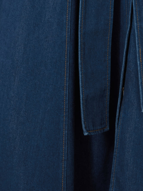 Denim shows its fluid side with this shirt dress for the new season. Designed in a mid-blue wash, the belted waist and handkerchief hemline lends beautiful movement to match its flowing shape. Match with a pair of high leather boots.