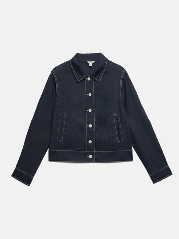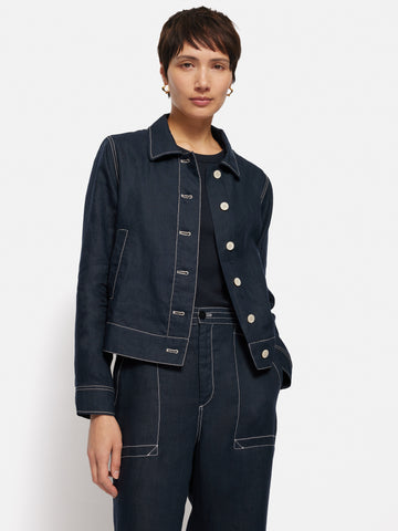 A simple yet effective layering solution. This versatile linen jacket features a standout contrast stitch detail and practical front pockets. Team with sliders and the matching trouser. Fit and Features