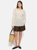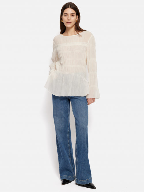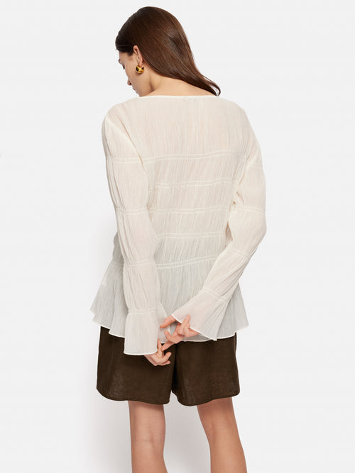 An ethereal long sleeve blouse cut from a crinkle cotton-viscose gauze. Asymmetrical, twin needle stitch smocking creates a beautiful silhouette, and adds stretch for an easy fit. Features a boat neckline and a delicate frill detail across the top row of smocking. Semi-sheer so layer over a simple vest for added coverage. Style with matching Gauze Viscose Ruched Skirt to create the most angelic co-ord for summer. Fit and Features