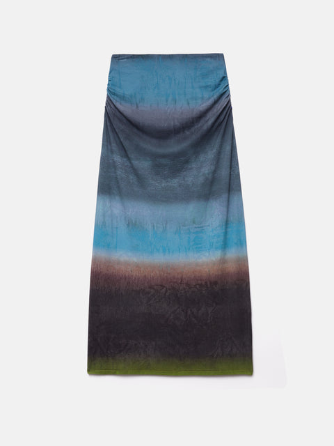 Nature-inspired hues meet an uplifting print with the Glazed Abstract Jersey Skirt, inspired by a trip to Frieze art fair and Robert Rauschenberg’s artwork “Scrape”. Subtle yet feminine ruching along the hips culminate in a flattering silhouette. For maximum effect, pair with the Glazed Abstract Jersey Top.