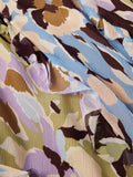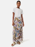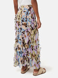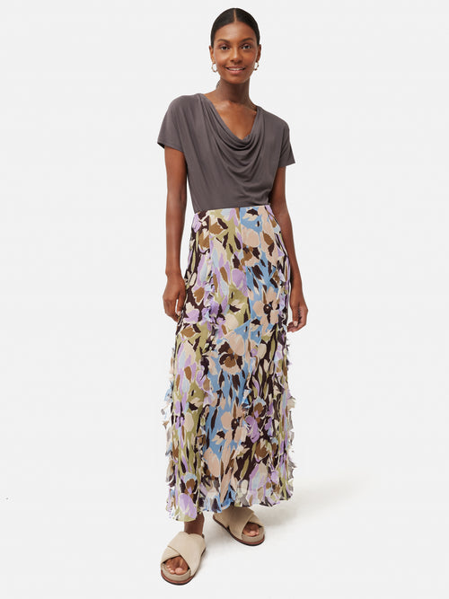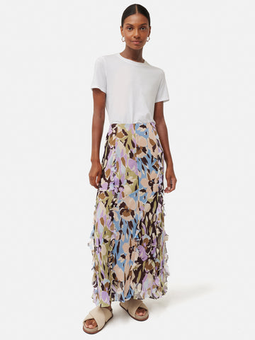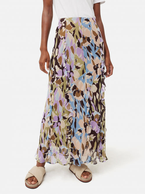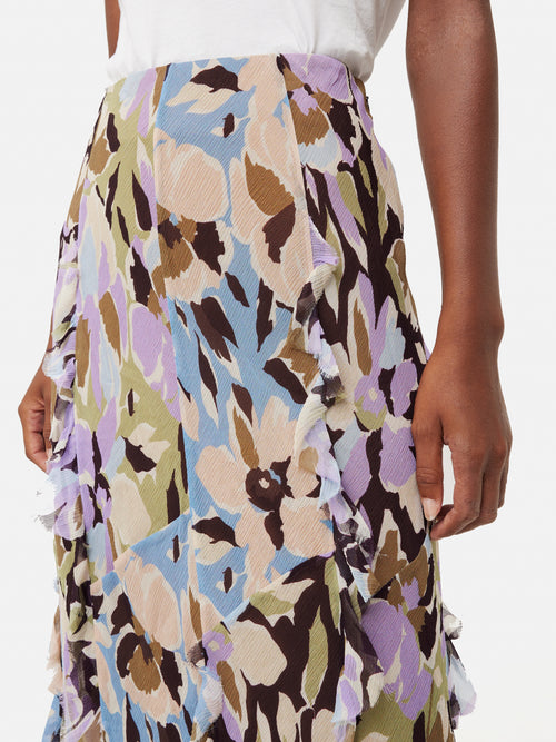 Patterned in-house, a beautiful skirt bias constructed in mixed coloured panels of our Graphic Pansy print. Bias cut in crinkled georgette viscose with raw edge frill details. Fully lined, with elastic waistband and invisible side zip. Style with a simple tee or matching Graphic Pansy Crinkle Top. Fit and Features