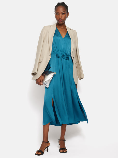 Step-up your occasionwear this summertime. Discover one-tone perfection with our Hammered Satin Midi dress, featuring elegant three-quarter length sleeves, a V-neck and side splits – imagined in an exquisite jewelled Parisian blue hue. A feminine ruched panel at the waist sculpts the silhouette, creating a flattering shape.