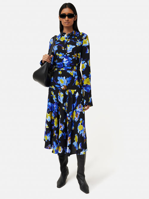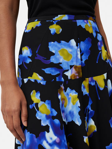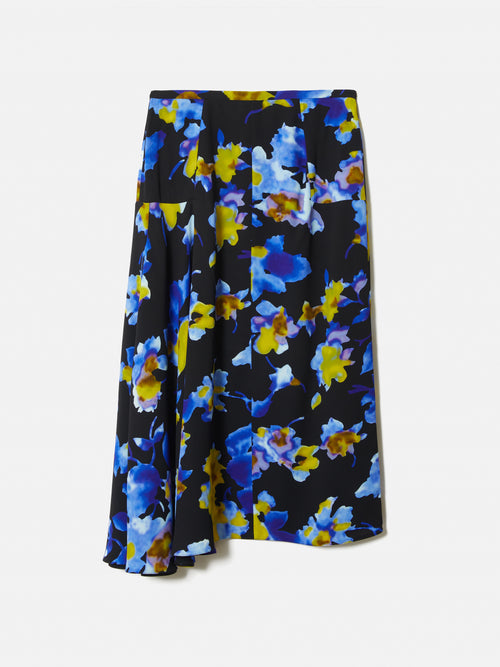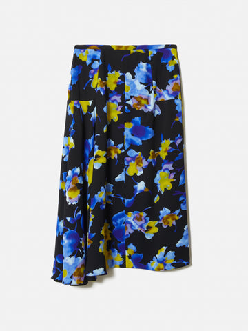 A new print, fabrication and style for Jigsaw, our exclusive in-house Haze Floral print arrives in a viscose crepe skirt. Patterned in-house to create the perfect fit, with a modern asymmetrical hemline. Features an invisible back zip. Make a modern co-ord with matching Haze Floral Shirt, or style it back with a more simple tee. Fit and Features