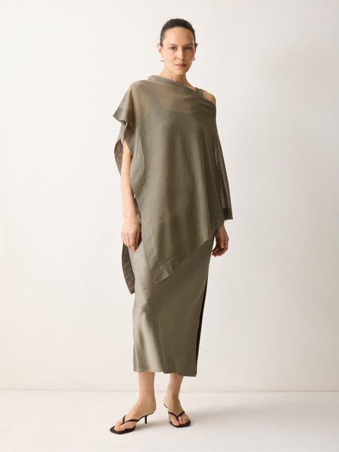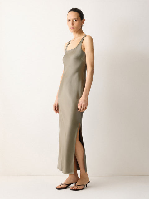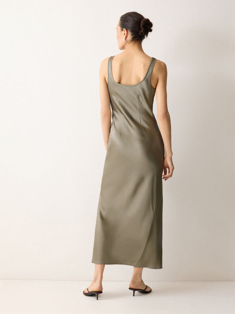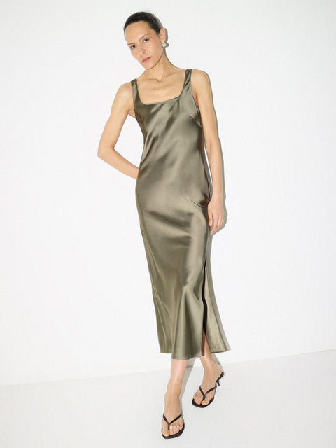 Your search for the perfect slip dress ends here for all the season's events. Designed in our bespoke Liquid Khaki shade, this beautiful maxi length design has been crafted from a heavyweight languid satin for scintillating depth and fluidity. Swapping the classic lace trim neckline for a simplistic scoop neck lends a clean, minimalist finish.