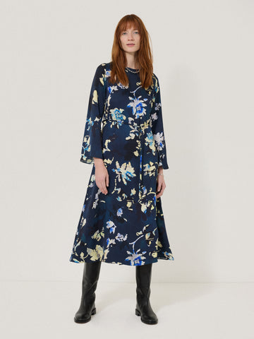 The Hidden Floral is a fusion of two of our archive prints; an unfinished hand-painted tapestry and a printed silk floral. One hides behind the other giving the illusion of an overlaid, distraught effect. Crafted from lightweight satin, this simple shift dress offers beautiful fluidity through the hips and skirt. A piece ready to make a bold statement day or night.
