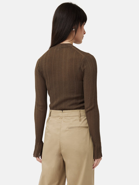 This season is all about the art of layering – and nothing beats these semi-sheer knits as your starting base. Crafted in a soft cotton blend, this delicate long-sleeved top retains its intricate plisse texture even after washing. Sculptural dropped shoulders and a sleek, slim fit throughout, this top will perfectly place under anything from a cashmere tank to a printed dress.