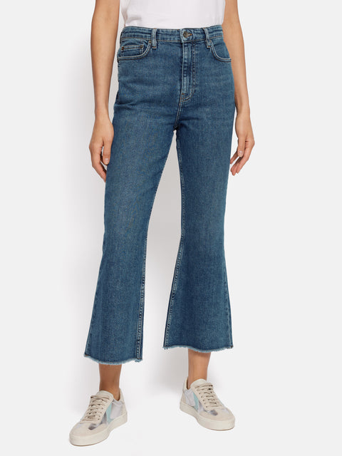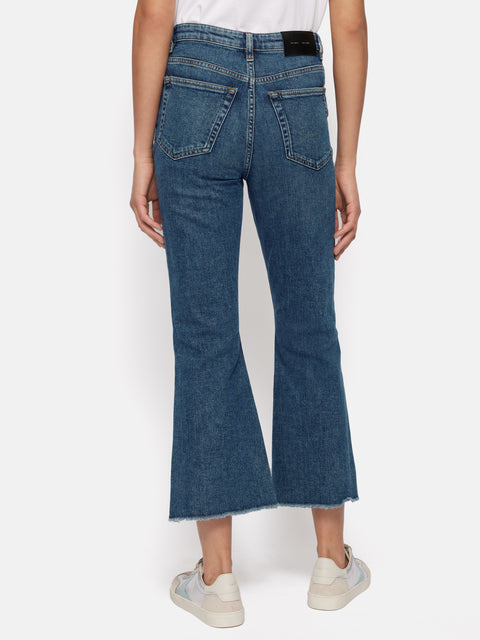 The jeans feature a playful silhouette with a subtle flare that elegantly kicks out at the hem, perfect for infusing your everyday outfits with a touch of personality and highlighting your favourite footwear. The raw hem edges contribute to their laid-back feel. Crafted with the same beloved quality, they are made from ethically sourced and 100% fixed denim, adorned with embossed metal rivets and a leather back patch.