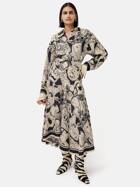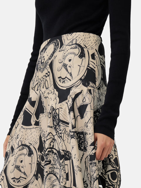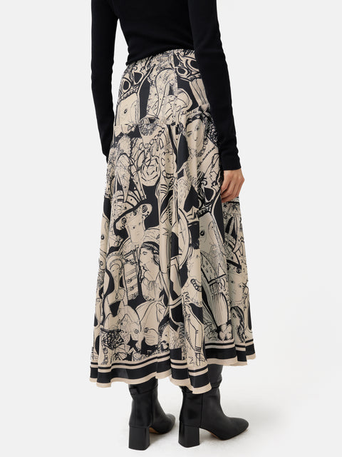 Crafted in celebration of the coronation, this unique and collectible skirt features the exclusive, hand-painted ‘Kings and Queens’ we commissioned from talented artist and previous collaborator, Janet Lance Hughes. Cut from fluid silk, this skirt will add a touch of royal charm to your daily style or formal event. Other pieces also available in this exclusive print, including a matching silk shirt.