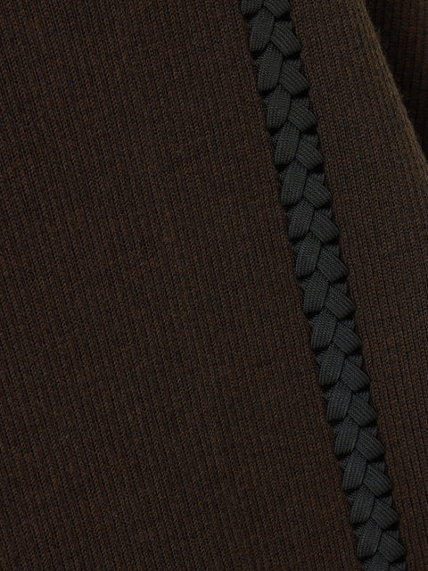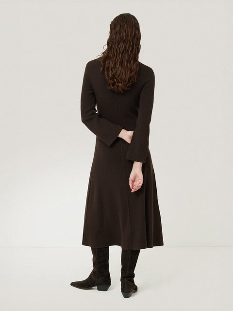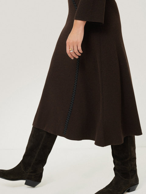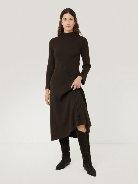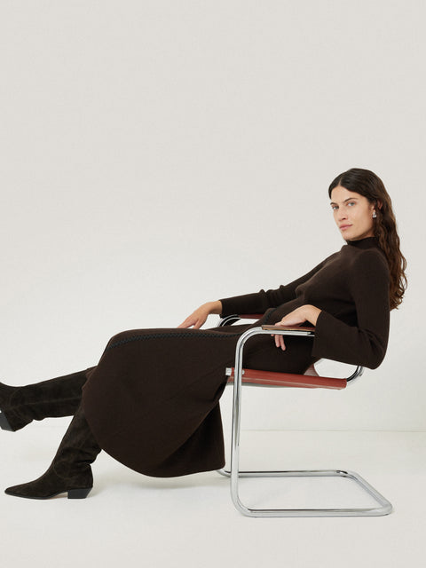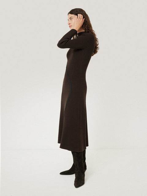 The knitted dress receives a playful rework for the new season with this chocolate brown design. A ribbed knit is met with lattice trim detail which curves around the dress for a textural feel, while the high neck silhouette adds a sleek finish. We love its midi length with knee high suede boots.