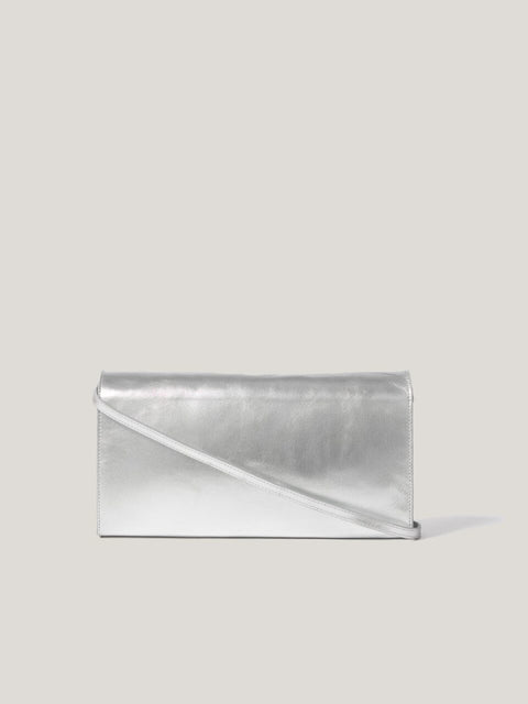 A Silver Clutch Bag with a fold over design is perfect for dressing up or down. Featuring an adjustable shoulder strap which can be tucked inside to create a seamless clutch style.