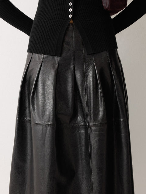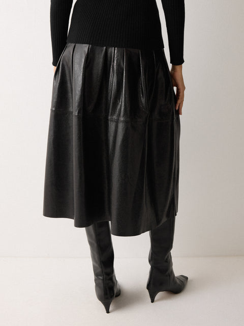 We’ve gone to great lengths in terms of volume when crafting this midi skirt. A play on a traditional silhouette, it’s finished with front pleat detail that results in a more voluminous A-line shape. With age and wear, the supple leather will develop a natural patina, resulting in a piece that’s entirely unique. Aksharra is 5'9.5 and wears a size 8