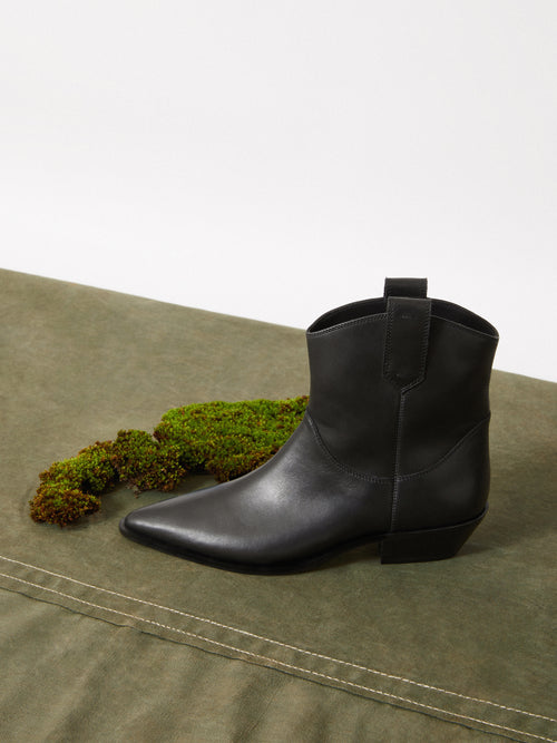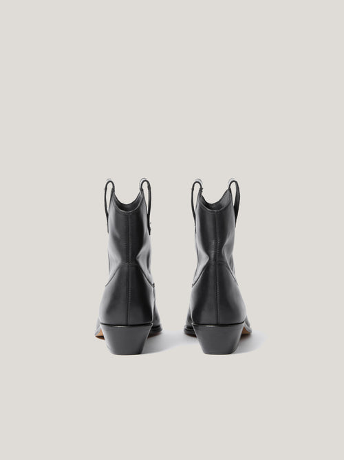 Soft leather meets a classic Western aesthetic with these ankle boots. Designed for a pointed toe and side pull tabs for ease slipping on and off, this pair are ready for striding out with all your midi dresses and jeans.