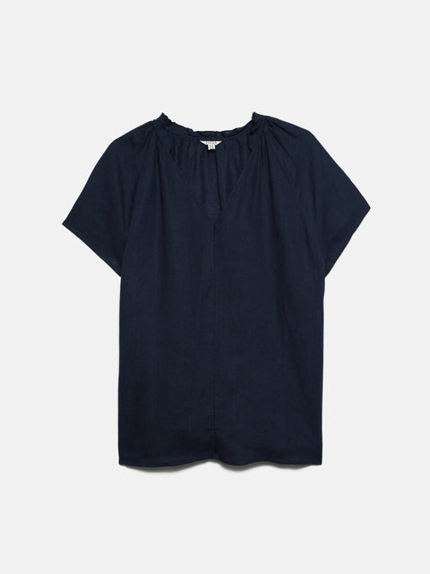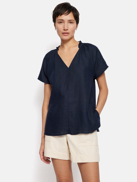 Relaxed lightweight top in 100% linen. Features a v-neck with ruffle detail and soft raglan short sleeves. Style with denim or chino shorts through summer. Fit and Features
