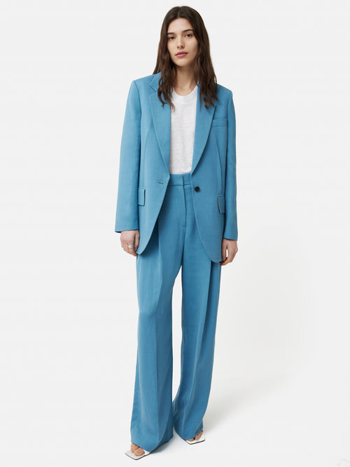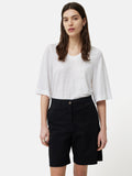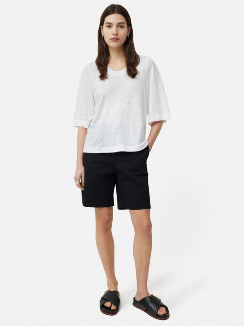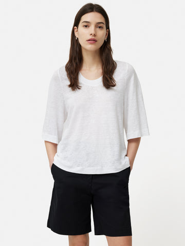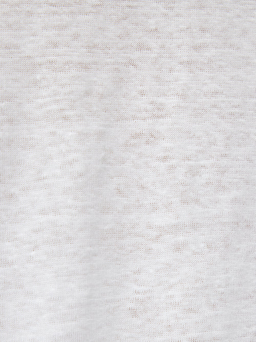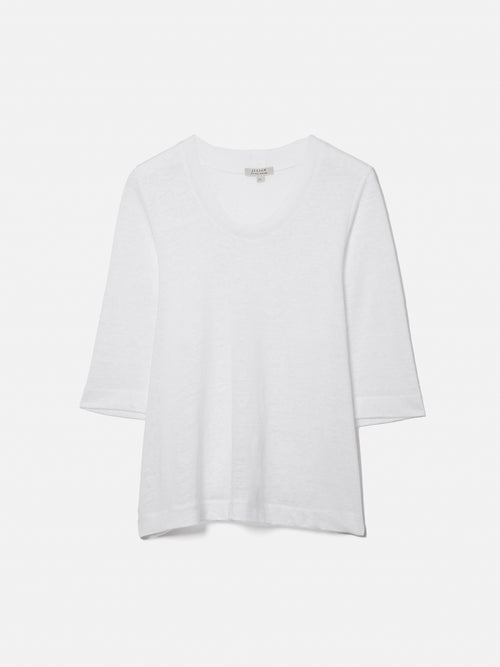 New tee silhouette crafted from lightweight linen jersey, featuring loose and wide sleeves for a laid-back look. The innovative neckline, seamlessly blending 'V' and scoop, is purposefully designed to accentuate your collarbone, creating an ideal showcase for your cherished jewellery