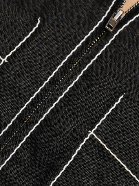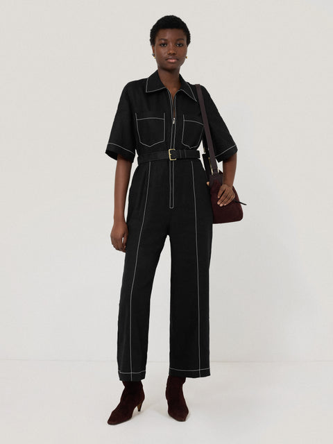 Our contemporary utility jumpsuit shape reinvented in linen for warmer weather. An easy-fitting shape with a wide leg and loose sleeves. Features a zip through front fastening with an elasticated back waistband for super comfort. Top pocket details, side pockets and back jetted pockets too. A one-step summer styling solution, style with a trainer or a chunky sandal.
