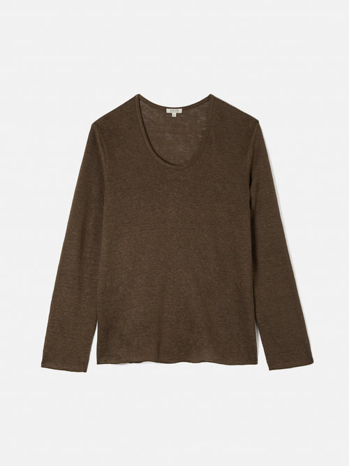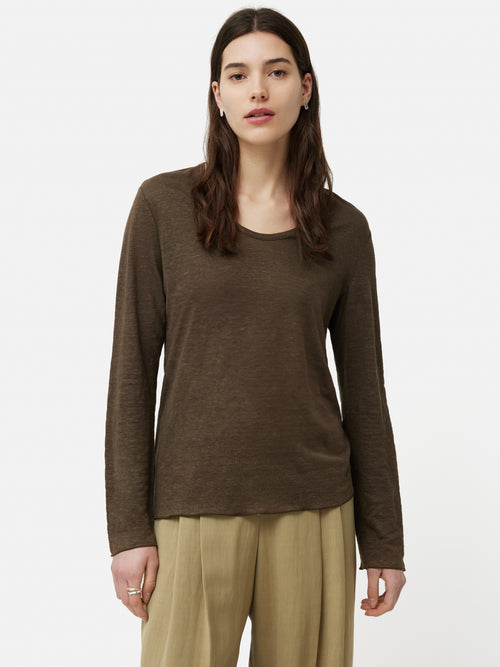 Introducing a fresh silhouette in our collection – the lightweight linen jersey top. Revel in the innovative neckline, a seamless fusion of 'V' and scoop, artfully designed to accentuate your collarbone and serve as the perfect backdrop for your beloved jewellery.