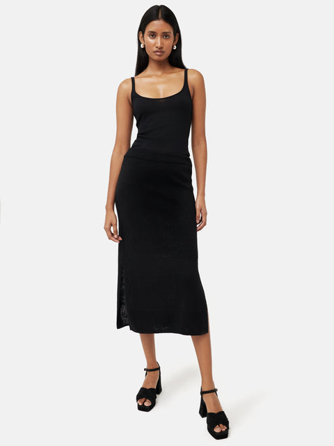 A pure, slubbed linen yarn straight midi skirt. Easy-fitting with side seam splits and elasticated, ribbed waistband and rib hem. Lined with an in-built slip. Style with matching tee or as a separate. Fit and Features