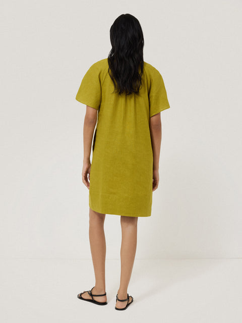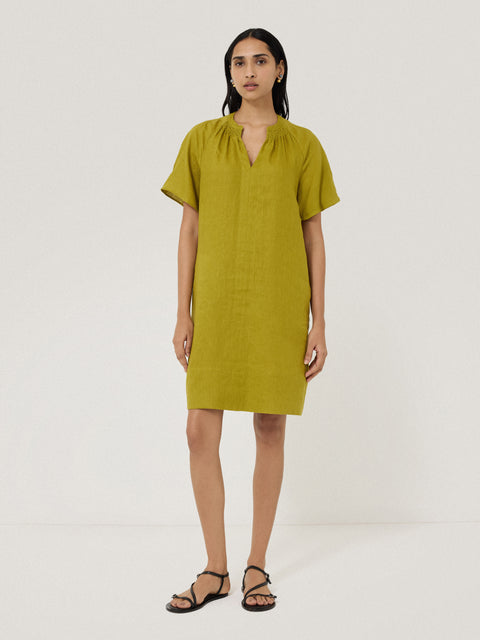 Nothing speaks of summer like lightweight linen pieces you can reach for again and again, that soften beautifully over time. This short sleeve dress has a relaxed fit for breezy summer days with a split V-neckline and smocking detail.