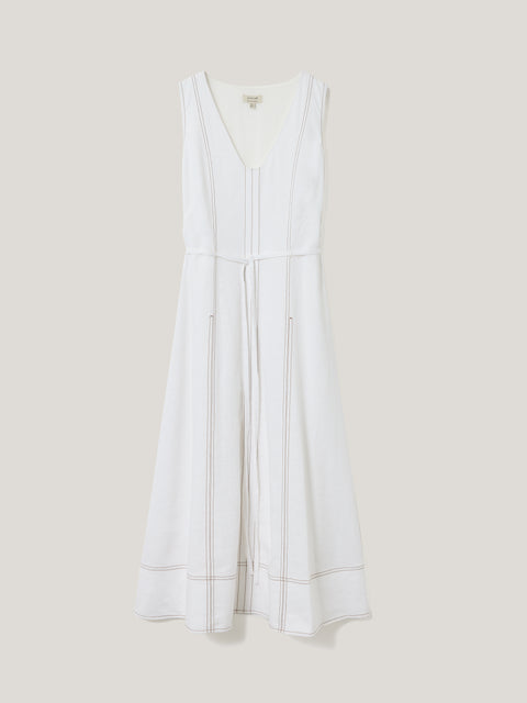 Stitched seam panels create an elongated silhouette with this midi dress for all your summer excursions. Crafted from a beautiful linen blend, it also features a detachable self-tie belt to dress up your look for evening with a more cinched-in shape.