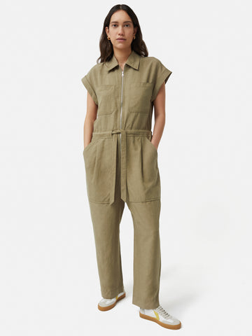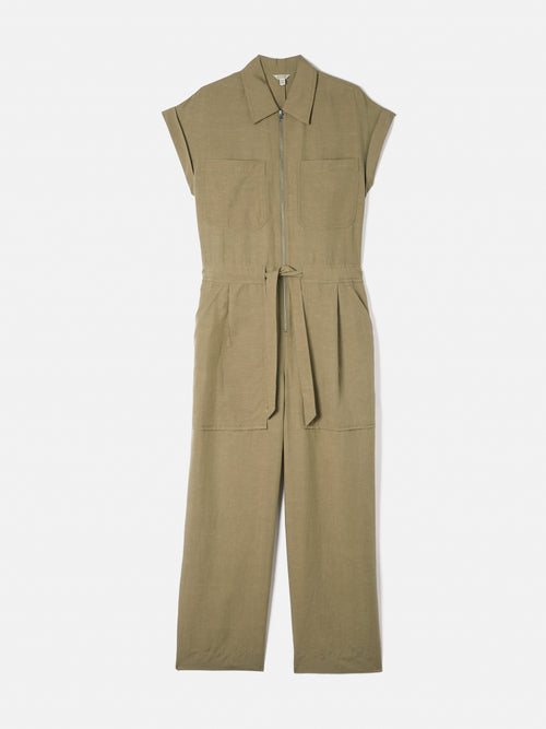 Linen Zip Front Jumpsuit | Khaki