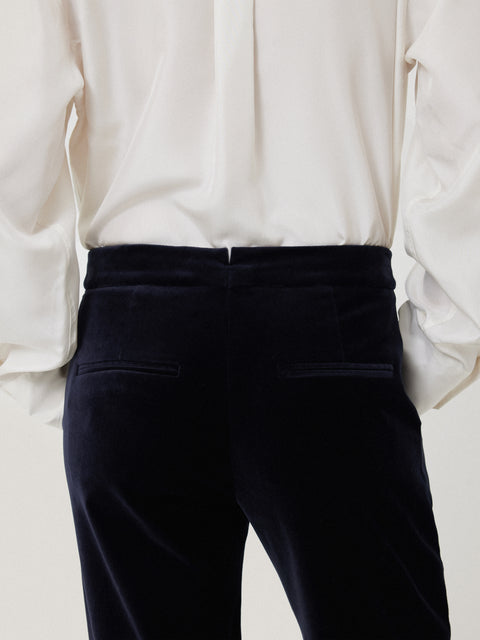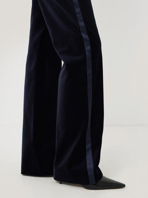 Our answer to the modern tux, these Mason navy velvet trousers form part of a full tailored suit in a choice of rich jewel tone velvets. We go against the grain when cutting our velvet to get the fullest colour and depth.