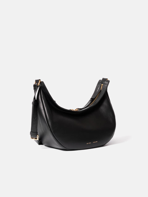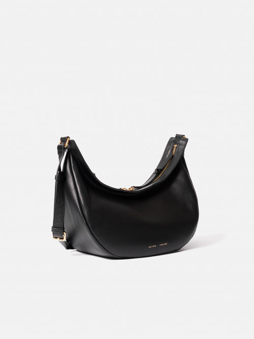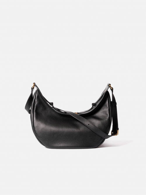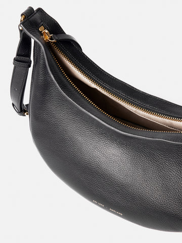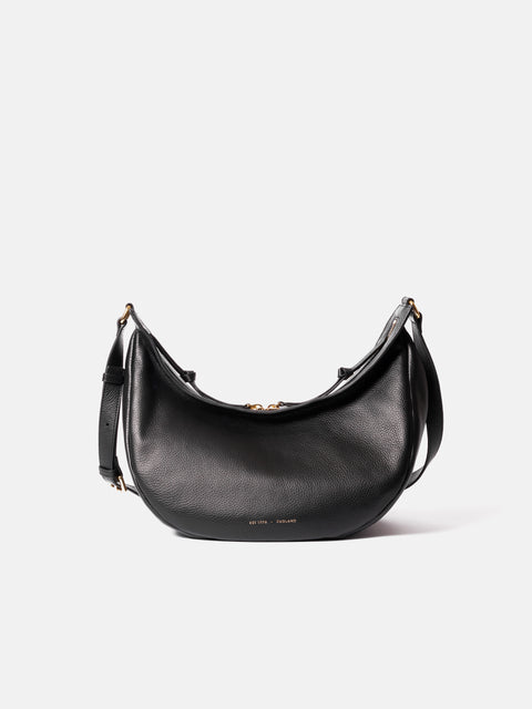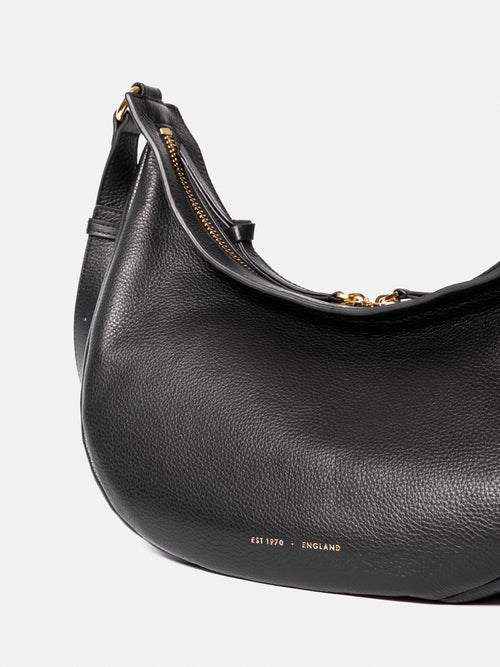 Our classic soft slouch shoulder bag, now available in black, supple, natural grain leather and trimmed with veg tanned leather. This practical style has zipped top closure and fully adjustable strap. Lined with cotton fabric, the interior features a flat back pocket for organising your essentials. Fit and Features