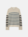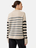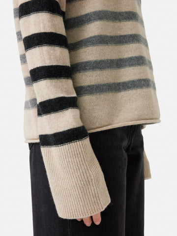 With its nautical stripes and a sumptuous blend of merino and cashmere yarn, this jumper meets all the criteria. The ribbed cuffs and neckline offer a structured, refined fit, while the understated rolled hem relaxes the silhouette. Designed with a regular fit, it effortlessly slips under coats and outer layers, ensuring both comfort and style. Fit and Features