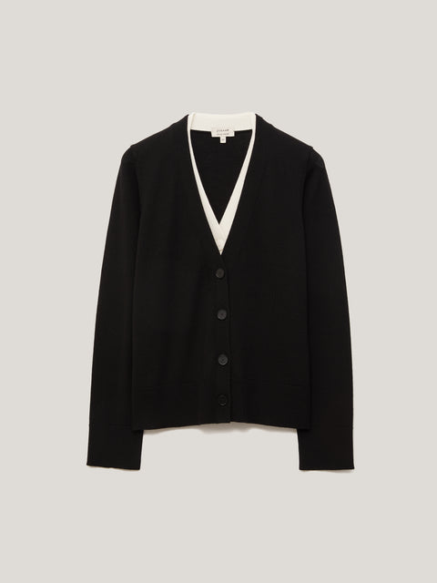 Designed to give the illusion of wearing two layers, this clever-thinking cardigan in soft merino wool features double panels to the front in a monochrome palette. Fasten up over sleek tailored pieces for a polished approach.