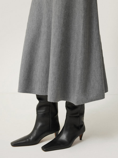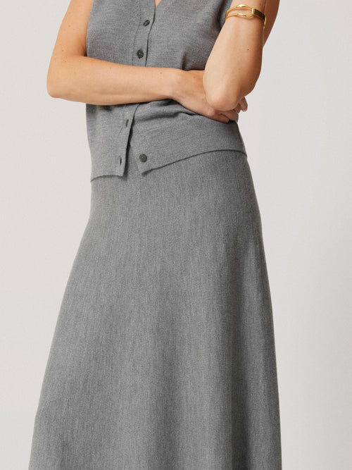 Beautiful merino wool provides lightweight warmth as seen with this classic midi skirt. Cut for a graceful silhouette that falls to the ankle, we love that this piece can be worn with the matching waistcoat or polo neck and a pair of knee high boots.