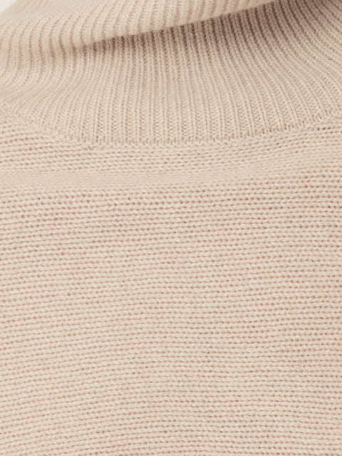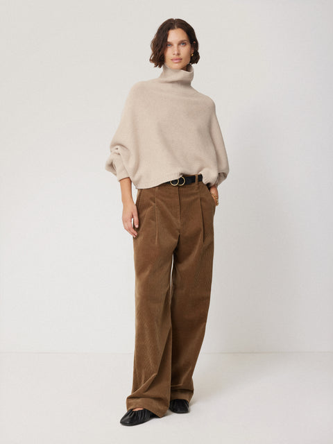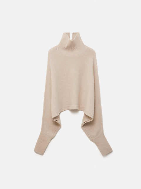 A unique fusion of a poncho and a jumper and crafted with luxurious merino wool, this piece features a distinctive design where half the sleeve remains fixed. The polo neck offers versatility with slit detail to fold up or down depending on your look. The boxy cropped silhouette allows for dynamic layering, inviting you to play with different looks by adding layers underneath.