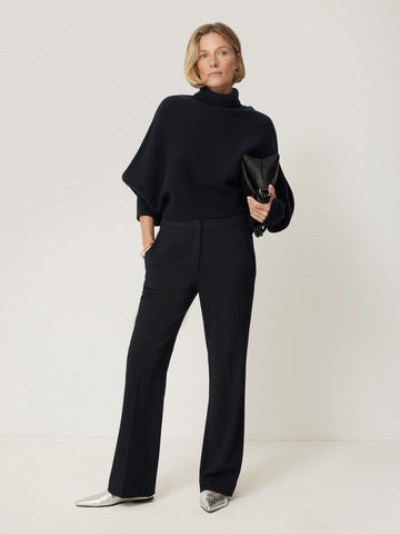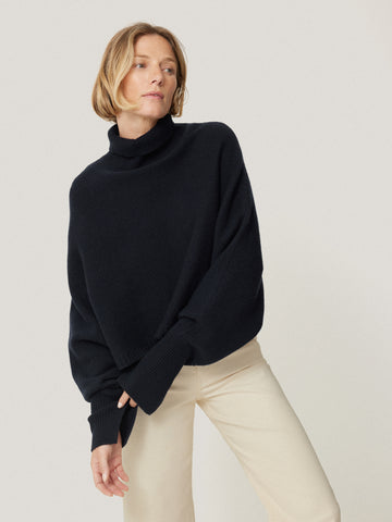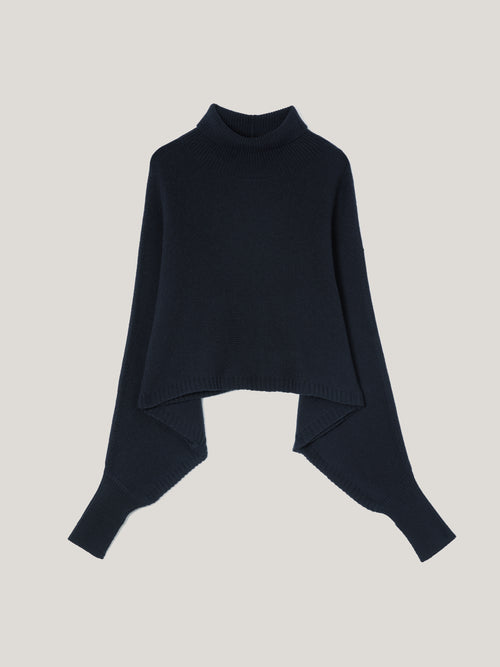 A unique fusion of a poncho and a jumper. Crafted with luxurious merino wool, this piece features a distinctive design where half the sleeve remains fixed. The polo neck boasts a slit, offering versatility to fold it down for varied styling options. Slightly cropped silhouette allows for dynamic layering, inviting you to play with different looks by adding layers underneath. Fit and Features