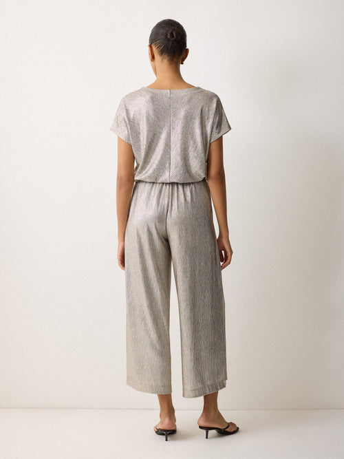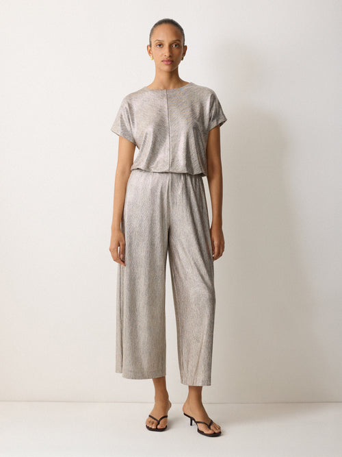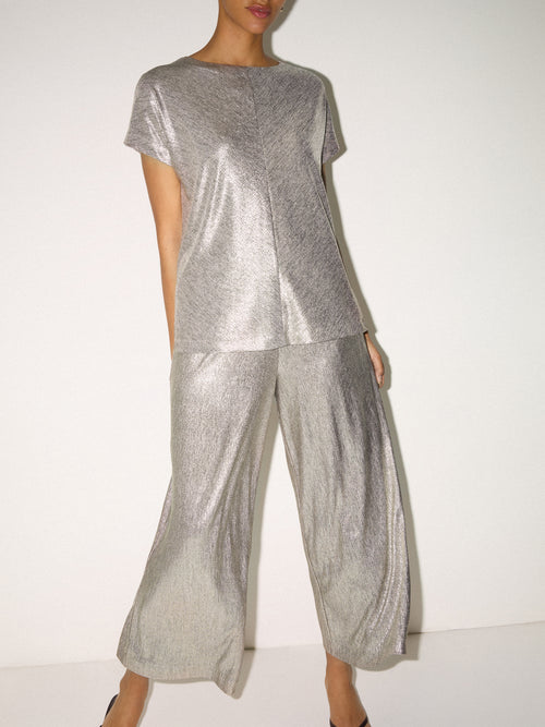 Shimmer during golden hour in this metallic top. Designed as part of a co-ord, the jersey design is accented with cap sleeves for an elegant twist. Match with the palazzo trousers or dress down with your favourite denim.