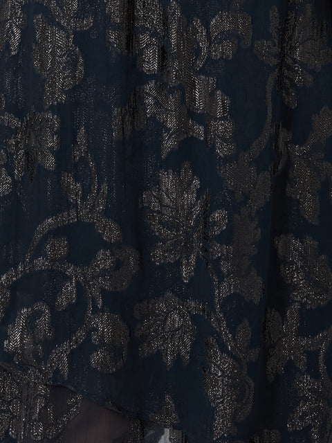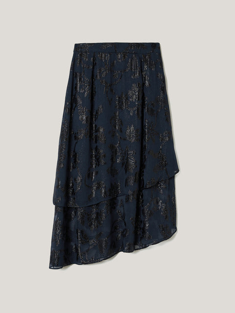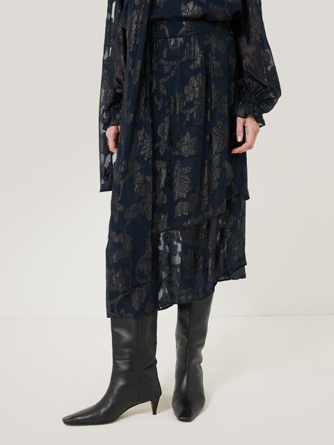 Party season calls for this navy midi skirt to make your shimmering debut in. Layers of metallic jacquard florals on a sheer crepe cascade across a fully flowing silhouette. Wear with the matching blouse for a head-to-toe look, or a chunky knit and boots for an elevated daytime look.