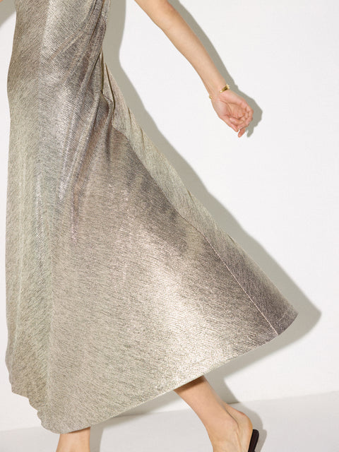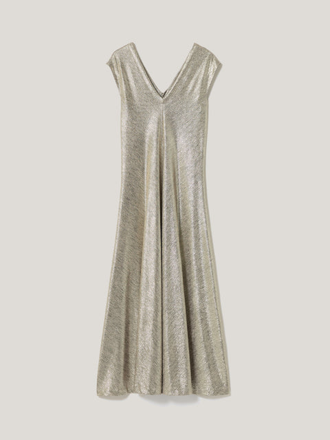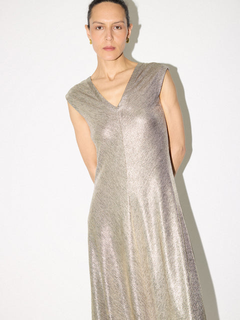 Embark on golden hour with only lustre in mind with this metallic maxi dress. Cut for a sleeveless silhouette with a flattering low V-neckline allows you to show off your sunkissed skin. Frame the look with a pair of chunky hoops and flats in similar flashes of silver and gold.