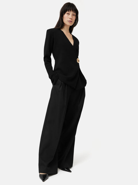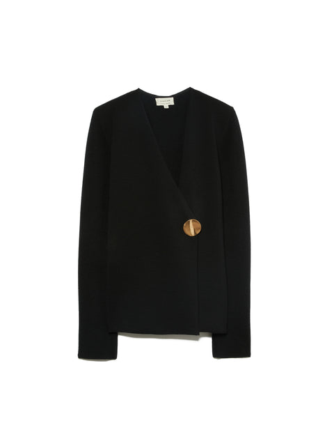 An emblem of versatility, our timeless knit cardigan distinguishes itself through our signature gold disc fastening. With detachable shoulder pads, tailor the silhouette to suit you opt for defined shoulders or embrace a more relaxed allure. Fit and Features