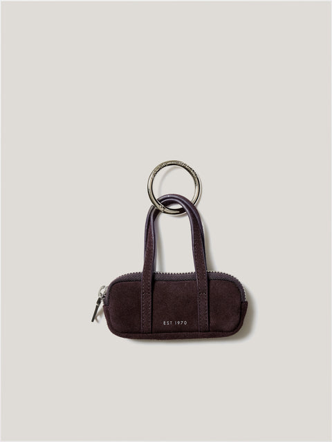 Our fashion-forward Baguette Bag has been shrunk down into a oxblood suede Bag Charm to accessorise with a silver carabiner-clip and working zip closure.