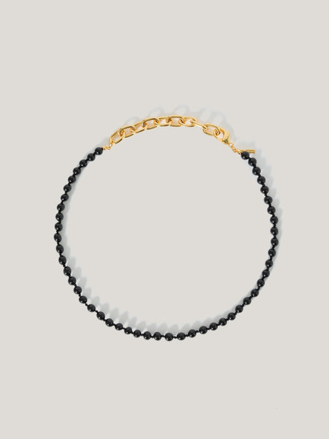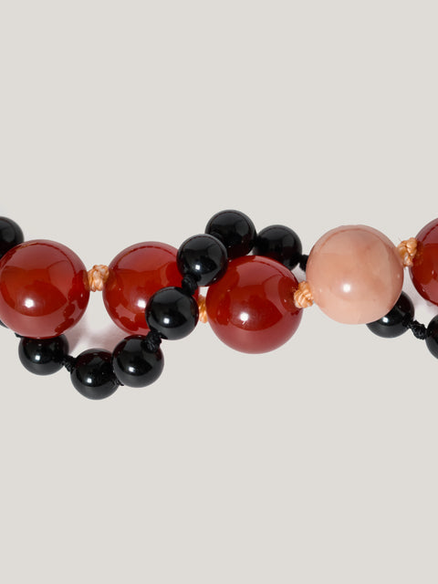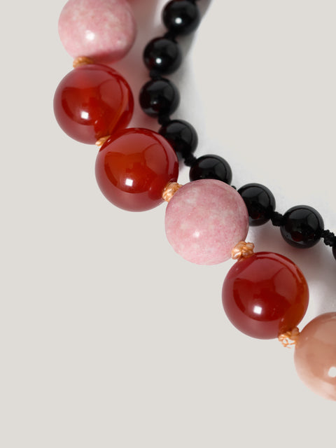 A necklace of semi-precious rose quartz and red chalcedony beads accompanies a black onyx beaded necklace to create a beautiful tonal palette; perfect for wearing solo or stacking with other beaded designs for a modern boho twist.