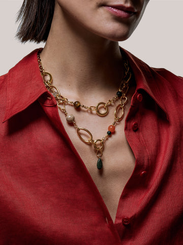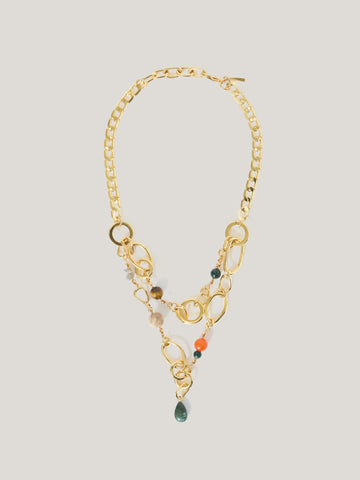 This statement necklace focuses on a concentric, double layered design in 24ct gold-plating, offset with a mix of colourful semi-precious stone beads that tap into the season's boho story.